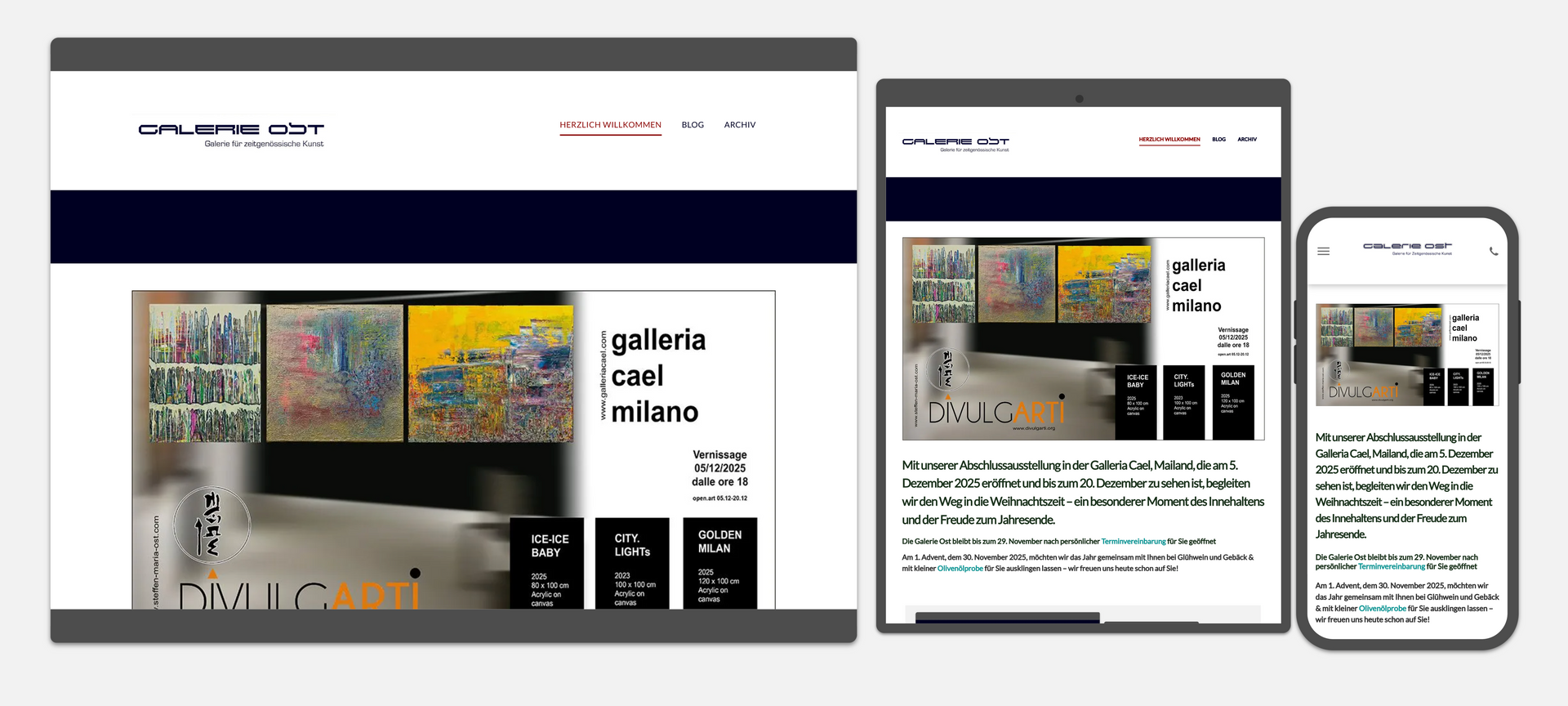 Mit unserer Abschlussausstellung in der Galleria Cael, Mailand, die am 5. 12. 2025 eröffnet und bis zum 20. Dezember zu sehen ist, begleiten wir den Weg in die Weihnachtszeit – ein besonderer Moment des Innehaltens und der Freude zum Jahresende.