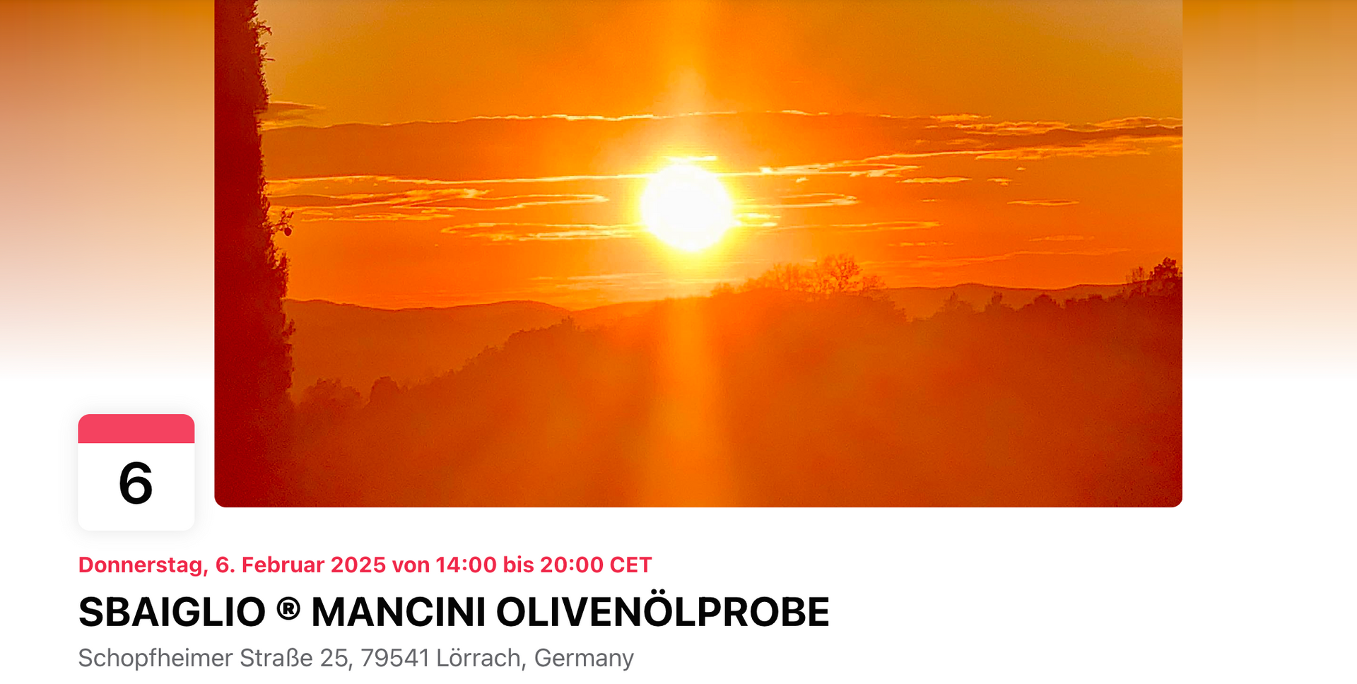 Am Donnerstag, den 6. Februar 2025, zwischen 14:00 und 20:00 Uhr heißen wir Sie willkommen, um die erlesenen Aromen unseres SBAIGLIO ® Mancini Olivenöls zu entdecken und zu genießen.
