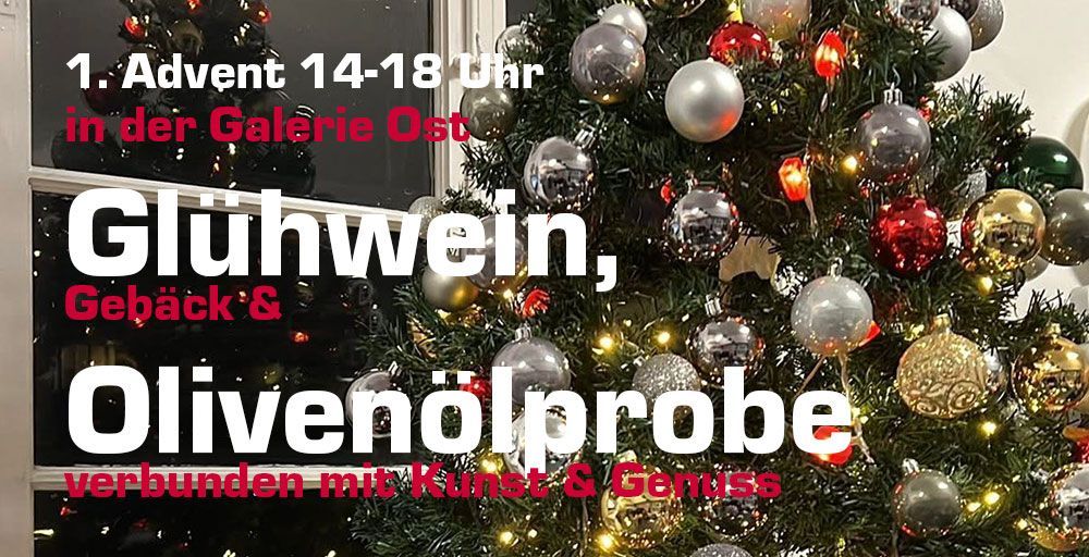 Der erste Advent in der Galerie Ost ist ein kleiner Moment voller Licht, Wärme und Vorfreude. Kerzenschein spiegelt sich auf den Kunstwerken, während der Duft von Glühwein und frisch gebackenem Gebäck die Sinne umspielt. Als besondere Zugabe erwartet Sie eine feine Olivenölprobe unseres SBAIGLIO – MANCINI Olivenöls – ein Tropfen toskanischer Sonne, der den Gaumen verführt und die kleinen Genussmomente noch intensiver macht. Verweilen Sie, lassen Sie den Alltag hinter sich und genießen Sie Kunst, Gespräche und kulinarische Highlights in harmonischer Verbindung.