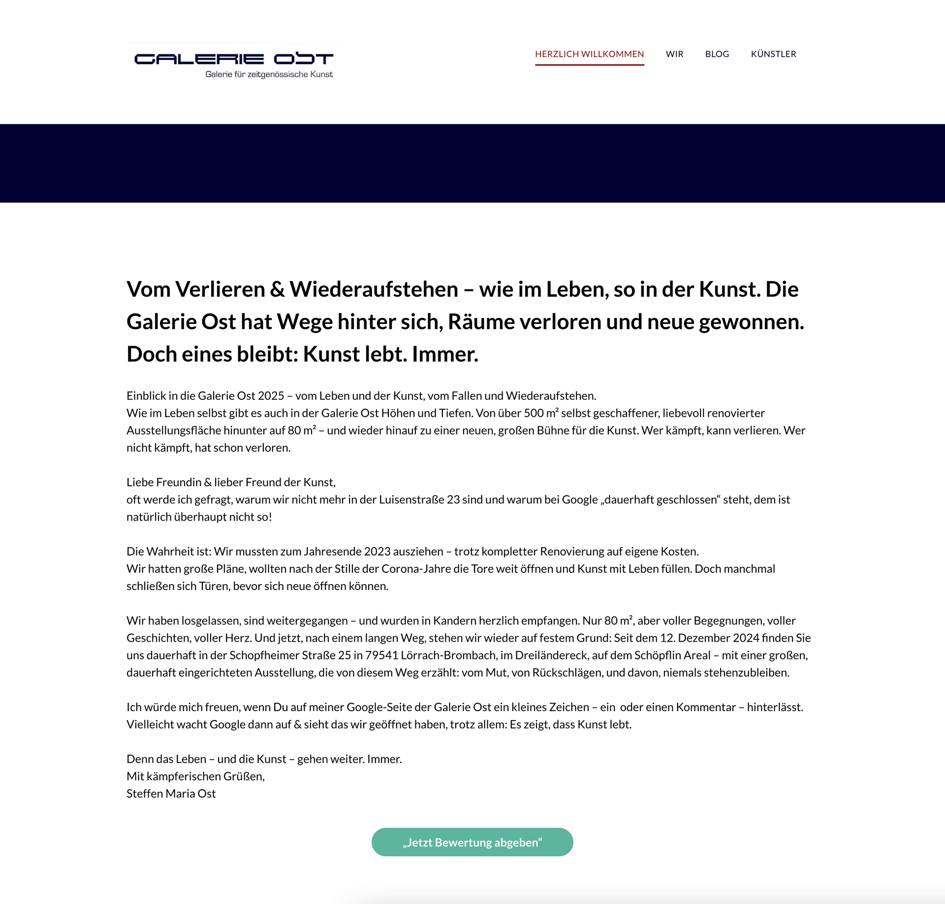 Vom Verlieren & Wiederaufstehen – wie im Leben, so in der Kunst. Die Galerie Ost hat Wege hinter sich, Räume verloren und neue gewonnen. Doch eines bleibt: Kunst lebt. Immer. Einblick in die Galerie Ost 2025 – vom Leben und der Kunst, vom Fallen und Wiederaufstehen. Wie im Leben selbst gibt es auch in der Galerie Ost Höhen und Tiefen. Von über 500 m² selbst geschaffener, liebevoll renovierter Ausstellungsfläche hinunter auf 80 m² – und wieder hinauf zu einer neuen, großen Bühne für die Kunst. Wer kämpft, kann verlieren. Wer nicht kämpft, hat schon verloren. Liebe Freundin & lieber Freund der Kunst, oft werde ich gefragt, warum wir nicht mehr in der Luisenstraße 23 sind und warum bei Google „dauerhaft geschlossen“ steht, dem ist natürlich überhaupt nicht so! Die Wahrheit ist: Wir mussten zum Jahresende 2023 ausziehen – trotz kompletter Renovierung auf eigene Kosten. Wir hatten große Pläne, wollten nach der Stille der Corona-Jahre die Tore weit öffnen und Kunst mit Leben füllen. Doch manchmal schließen sich Türen, bevor sich neue öffnen können. Wir haben losgelassen, sind weitergegangen – und wurden in Kandern herzlich empfangen. Nur 80 m², aber voller Begegnungen, voller Geschichten, voller Herz. Und jetzt, nach einem langen Weg, stehen wir wieder auf festem Grund: Seit dem 12. Dezember 2024 finden Sie uns dauerhaft in der Schopfheimer Straße 25 in 79541 Lörrach-Brombach, im Dreiländereck, auf dem Schöpflin Areal – mit einer großen, dauerhaft eingerichteten Ausstellung, die von diesem Weg erzählt: vom Mut, von Rückschlägen, und davon, niemals stehenzubleiben. Ich würde mich freuen, wenn Du auf meiner Google-Seite der Galerie Ost ein kleines Zeichen – ein oder einen Kommentar – hinterlässt. Vielleicht wacht Google dann auf & sieht das wir geöffnet haben, trotz allem: Es zeigt, dass Kunst lebt. Denn das Leben – und die Kunst – gehen weiter. Immer. Ich freue mich auf Ihre Rezzesion in Google & sage jetzt schon vielen Dank! Mit kämpferischen Grüßen, Steffen Maria Ost
